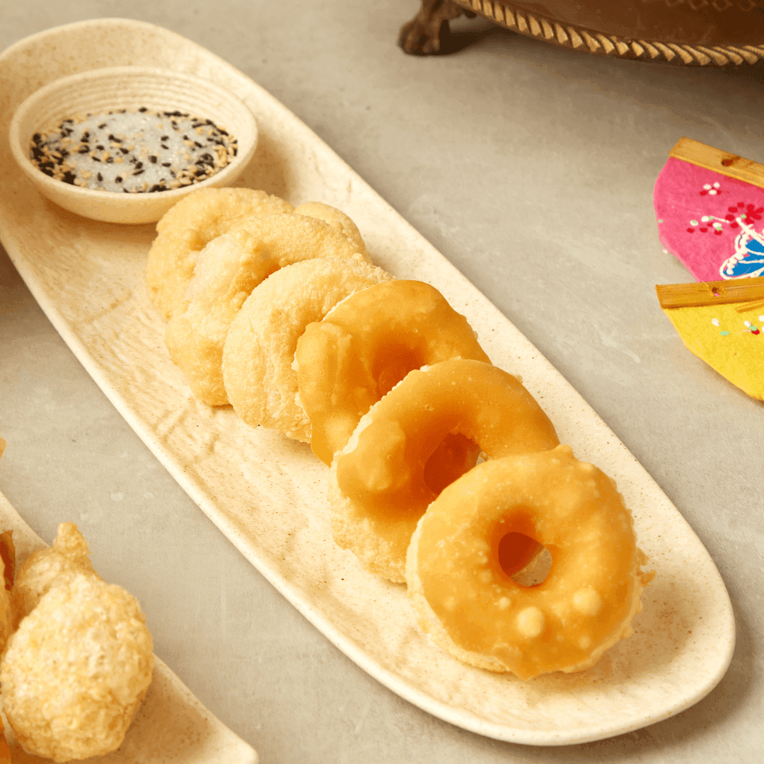 Sugar cane glazed doughnut, served with sugar, sesame, and peanuts